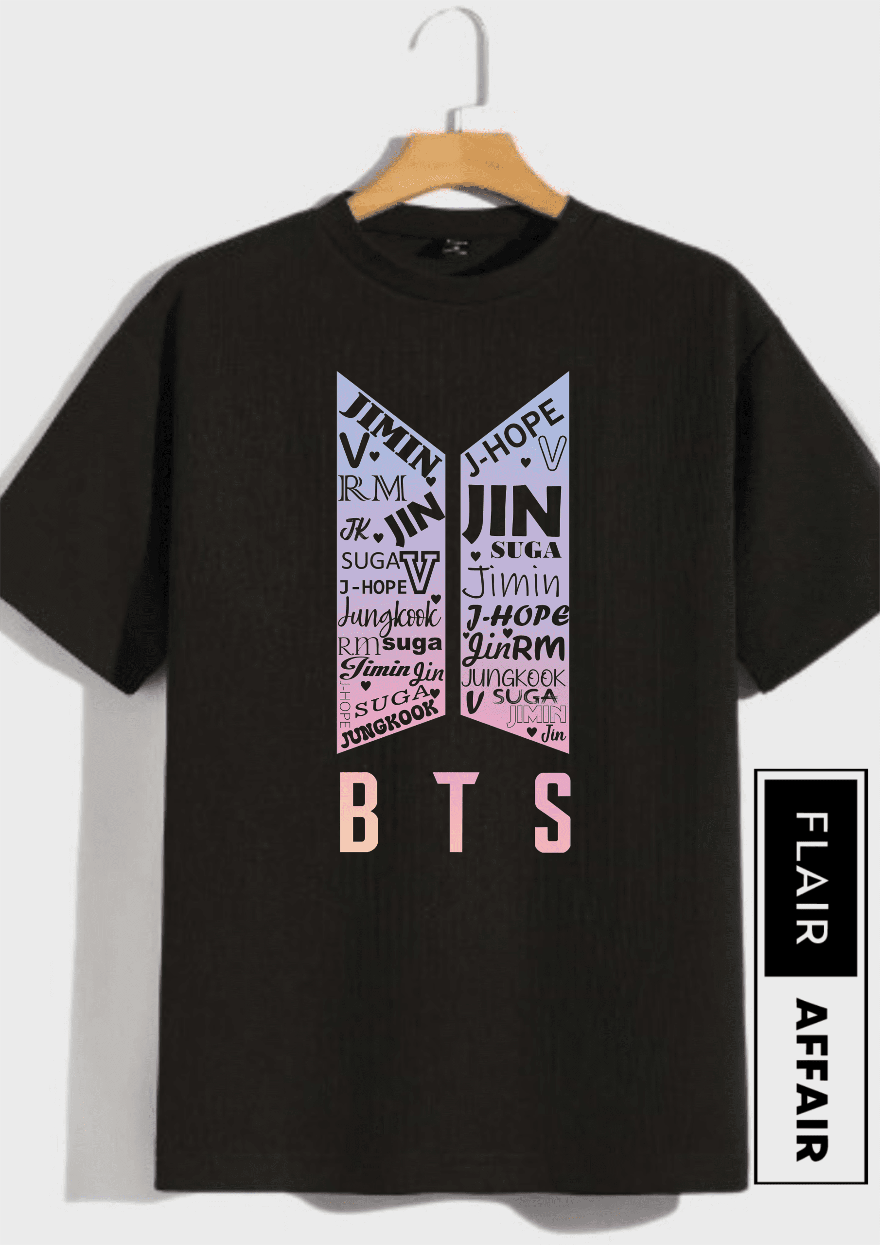 Show your love for BTS with our brand-new BTS Fan Army T-Shirt πŸ’œ. Designed for true ARMY fans, this tee features a bold BTS logo filled with the members’ names β€” Jimin, Jungkook, V, Suga, Jin, J-Hope, and RM β€” in a striking blend of purple, pink, and pastel tones.