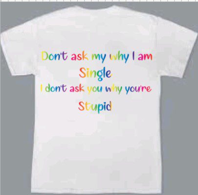 Make a bold statement with our “Don’t Ask Me Why I’m Single, I Don’t Ask You Why You’re Stupid” T-shirt — perfect for those who appreciate a sharp sense of humor and aren’t afraid to speak their mind. Crafted from soft, breathable fabric, this tee offers both comfort and style, making it ideal for casual outings or relaxed days at home. Whether you’re single by choice or just enjoying your independence, this shirt sends a witty message that’s sure to turn heads and spark laughs. Available in various sizes to fit you perfectly.