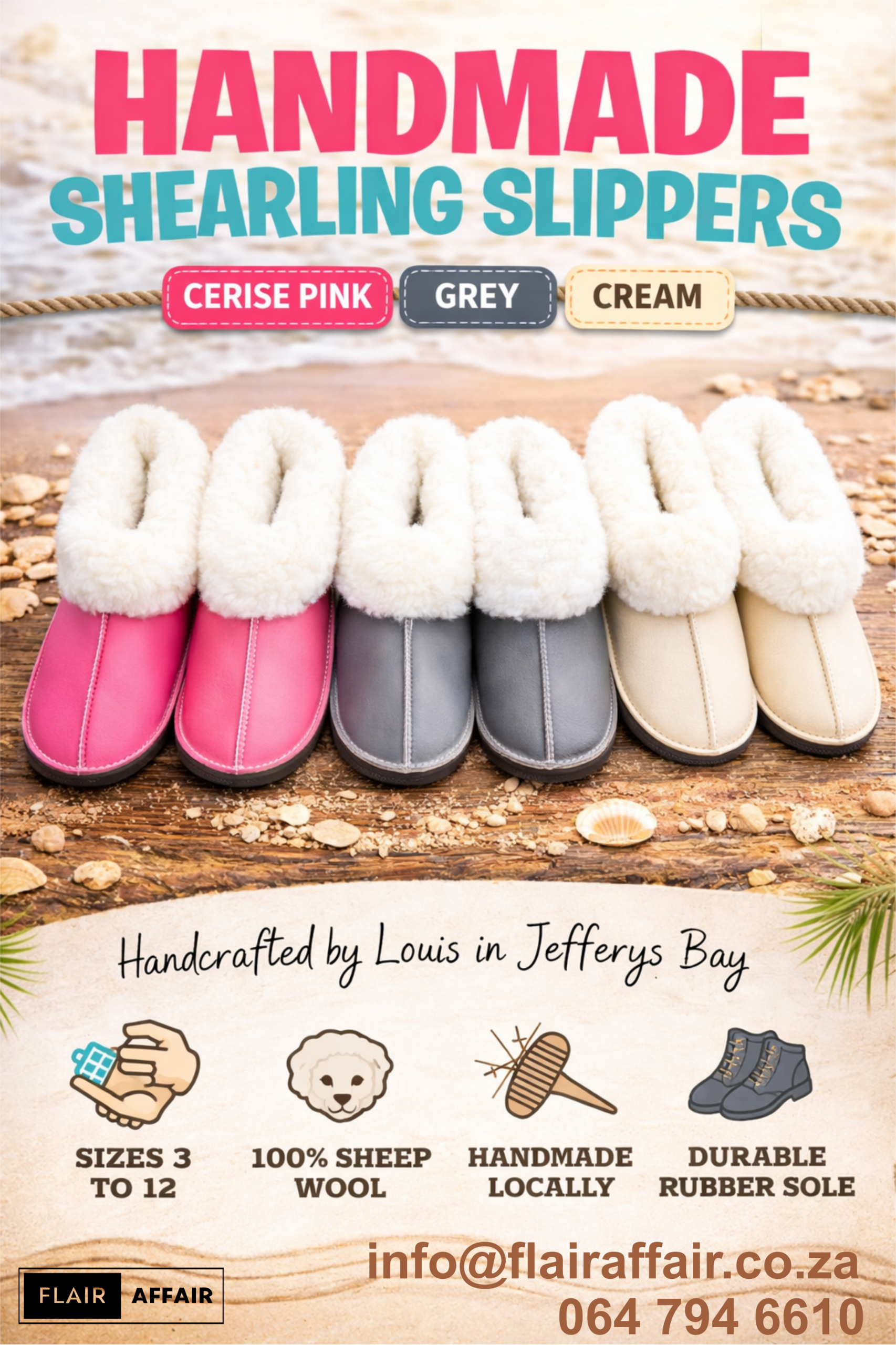 Each pair is carefully handcrafted by Louis in Jeffreys Bay, combining genuine leather, natural sheep wool, and traditional craftsmanship to create a product that’s both beautiful and built to last.