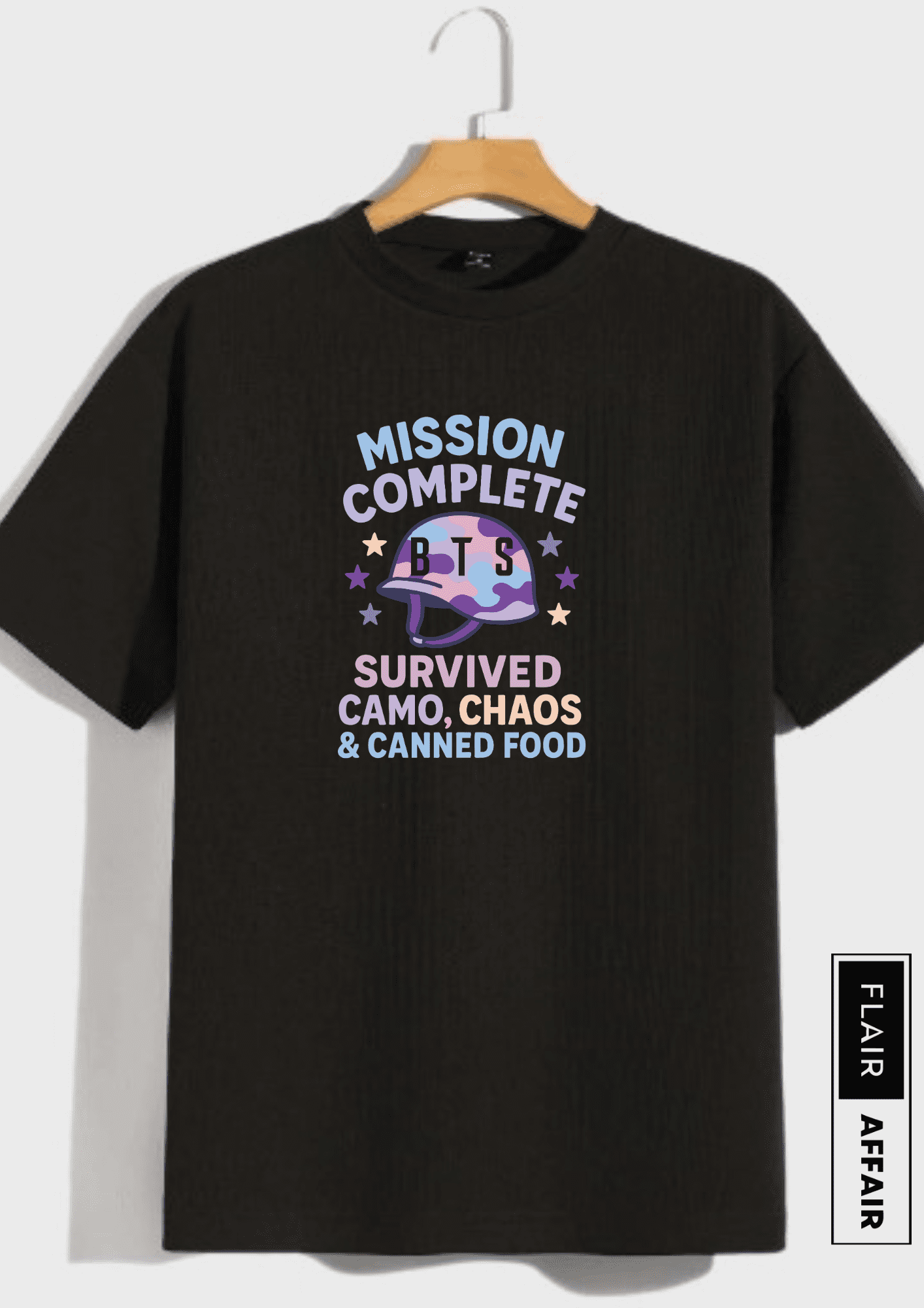 Celebrate their heroic homecoming with a twist of humor! Our MISSION COMPLETE design honors the bravery, the battle, and — let’s be honest — the mystery meat in those ration packs. Whether you choose the T-shirt, hoodie, or mug, this colorful design using official BTS-inspired tones makes a bold statement: they survived camo, chaos, and canned food — and now, they’re back!