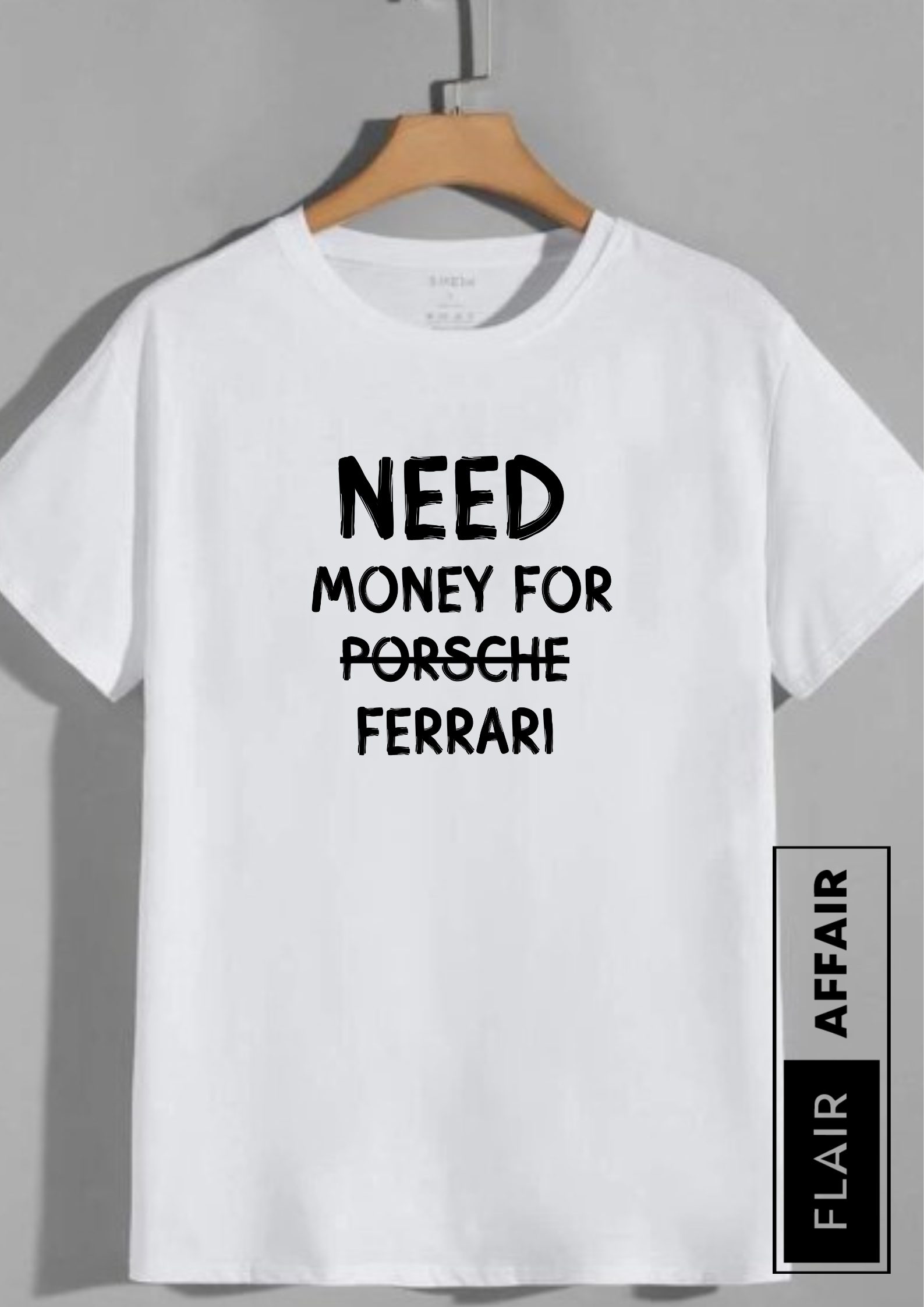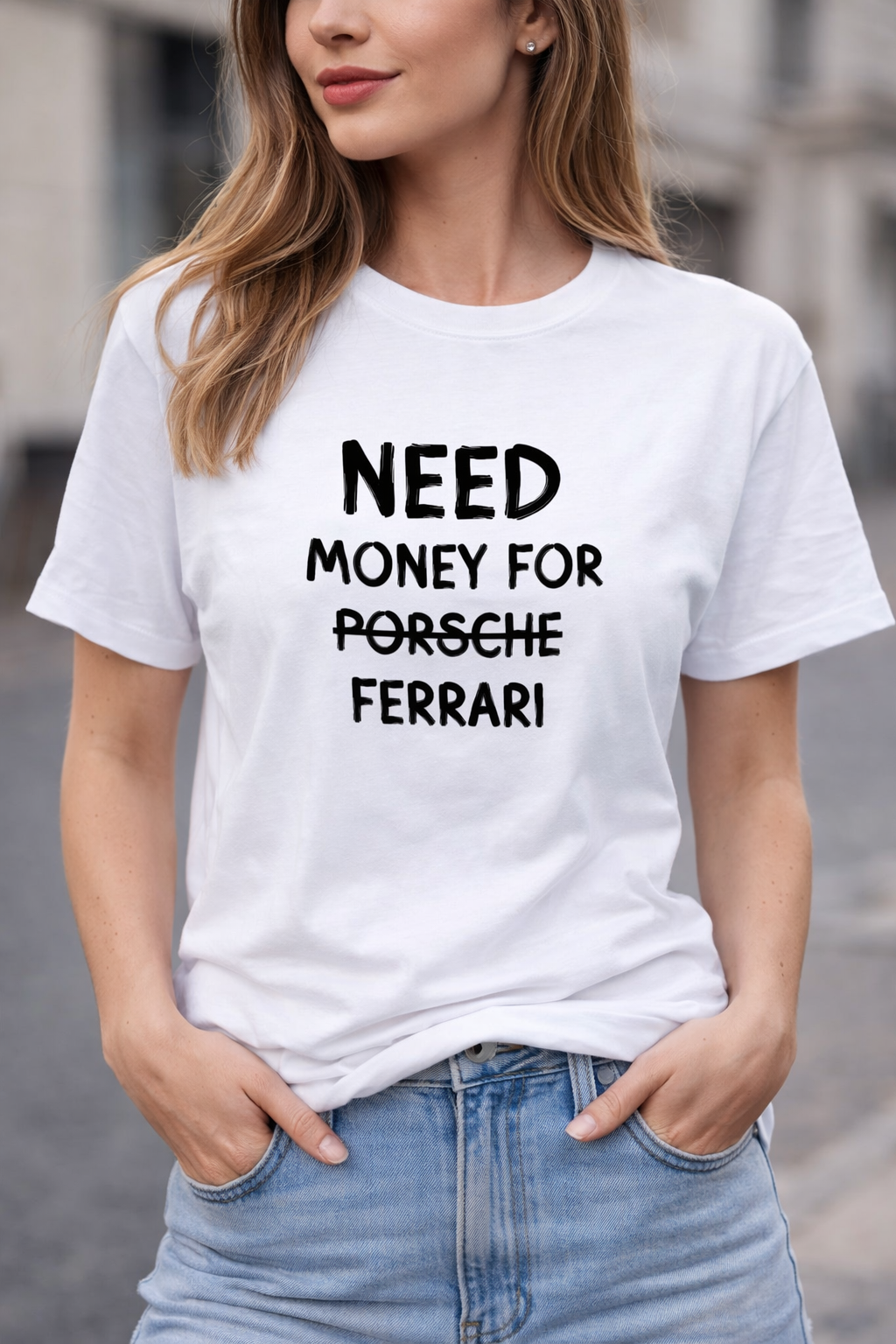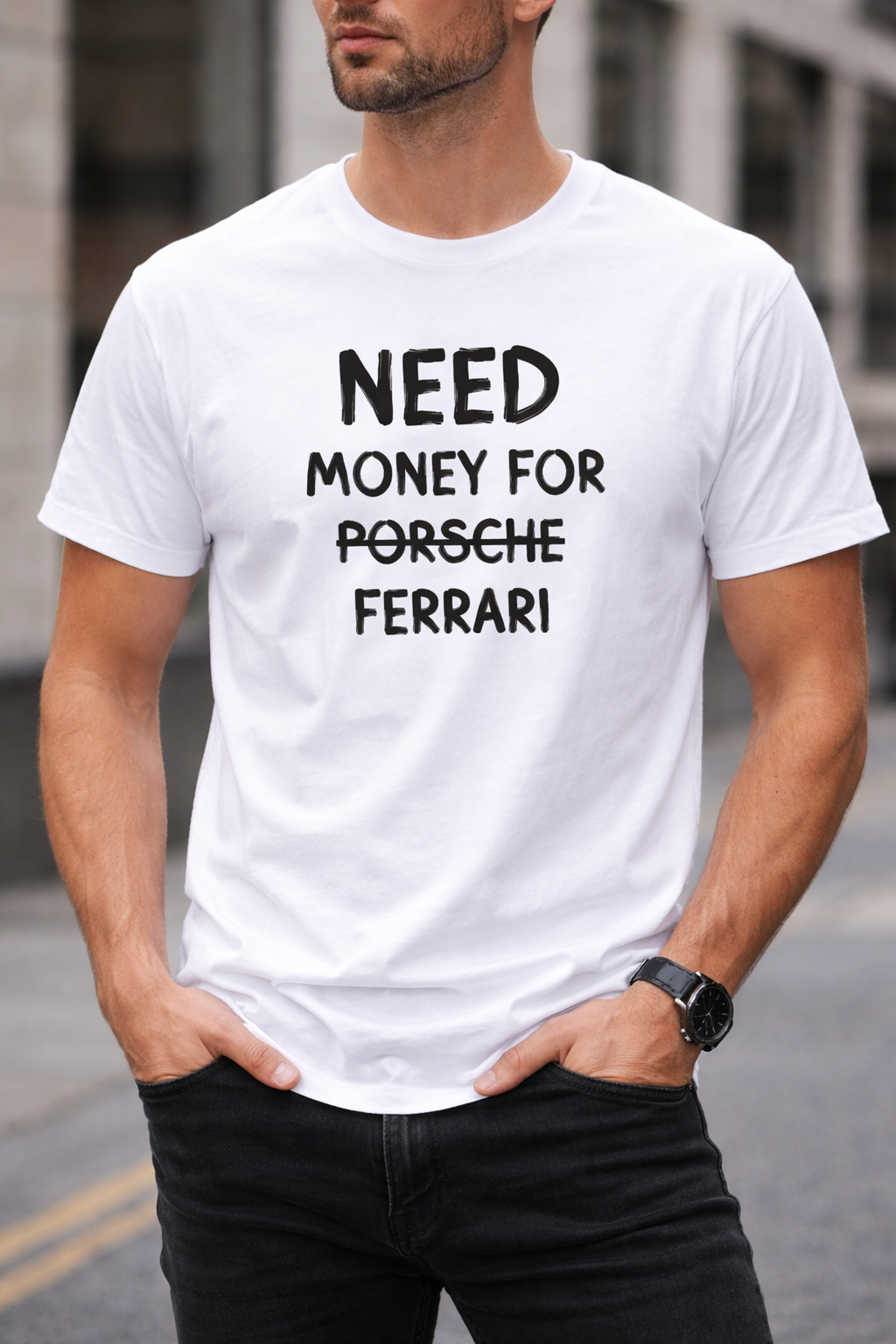 This “Need Money for Ferrari” T-shirt is the perfect mix of humor and style. With its bold crossed-out design, it’s guaranteed to turn heads, start conversations, and get a few laughs wherever you go.